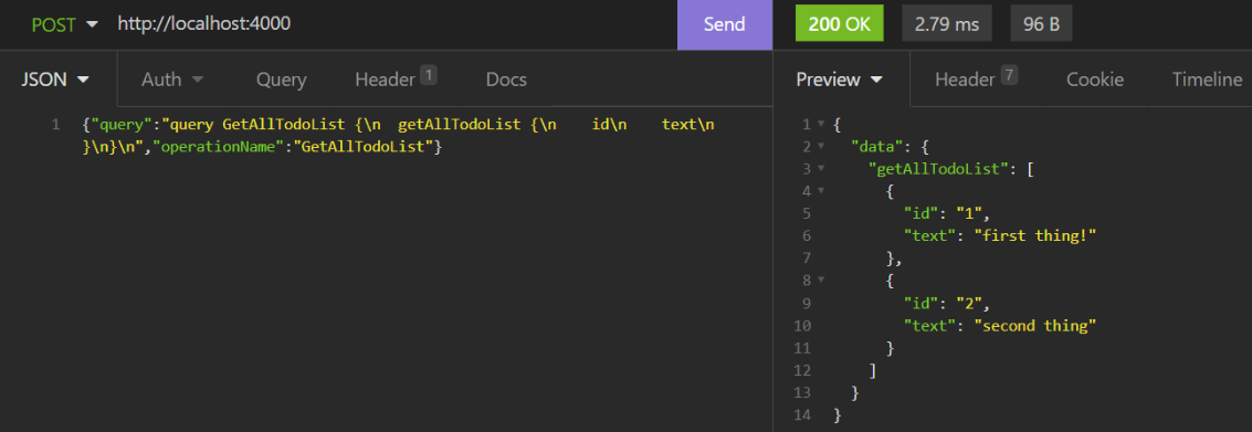 아래 HTTP POST Body의 GraphQL 형식의 Json을 이해하는 ApolloServer는 전달받은 쿼리에 대한 응답을 할 수 있게 됨.