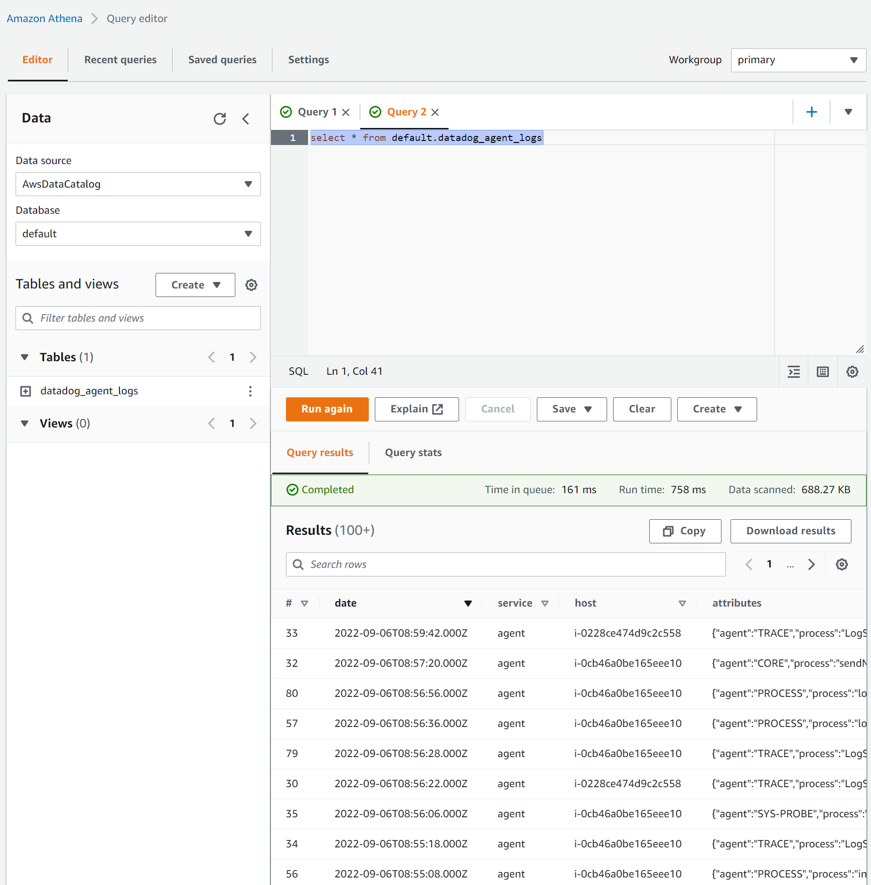 Datadog에서 Amazon S3에 저장된 로그들의 포맷이 JSON 형태로 저장되기 때문에 바로 Amazon Athena 사용이 가능합니다.