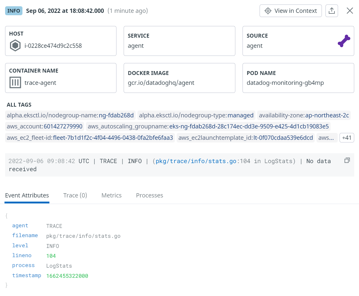{"date":"2022-09-06T08:20:16.000Z","service":"agent","host":"i-0cb46a0be165eee10","attributes":{"agent":"PROCESS","process":"logCheckDuration","filename":"collector.go","lineno":202.0,"level":"INFO","timestamp":1662452416000},"_id":"AYMR4sHBAADVWXzyJTYPRwAI","source":"agent","message":"2022-09-06 08:20:16 UTC | PROCESS | INFO | (collector.go:202 in logCheckDuration) | Finish pod check #59180 in 3.326592ms","status":"info","tags":["image_id:docker-pullable://gcr.io/datadoghq/agent@sha256:0e31fa27eafec6d4d354a9a5f2c9dcfe073fb316c5bebaa15519f7b1e9f7ba14","display_container_name:process-agent_datadog-monitoring-qvpb8","dirname:/var/log/pods/datadog-agent_datadog-monitoring-qvpb8_371382c3-d95e-4b3a-abec-9a19024ff3ea/process-agent","kube_container_name:process-agent","kube_app_component:agent","kube_app_name:datadog-monitoring","pod_phase:running","source:agent","kube_daemon_set:datadog-monitoring","image_name:gcr.io/datadoghq/agent","kube_ownerref_kind:daemonset","docker_image:gcr.io/datadoghq/agent:7.35.0","container_name:process-agent","short_image:agent","container_id:89281e425b0f796202d7c5f10b9139220036363f712a1d29fb68727504712a2e","kube_namespace:datadog-agent","kube_app_instance:datadog-monitoring","pod_name:datadog-monitoring-qvpb8","image_tag:7.35.0","kube_service:datadog-monitoring","kube_app_managed_by:helm","filename:0.log","kube_ownerref_name:datadog-monitoring","service:agent","alpha.eksctl.io/nodegroup-name:ng-fdab268d","alpha.eksctl.io/nodegroup-type:managed","availability-zone:ap-northeast-2b","aws_account:601427279990","aws_autoscaling_groupname:eks-ng-fdab268d-28c174ec-dd3e-9509-e425-4d1cb19083e5","aws_ec2_fleet-id:fleet-538494a4-173f-c33c-0692-0eaa000af1dd","aws_ec2launchtemplate_id:lt-0f070cdaa539e6dcd","aws_ec2launchtemplate_version:1","aws_eks_cluster-name:hyunjin-eks","cluster_name:aws-isv-workshop","eks_cluster-name:hyunjin-eks","eks_nodegroup-name:ng-fdab268d","iam_profile:eks-28c174ec-dd3e-9509-e425-4d1cb19083e5","image:ami-03f5c5b7ba2015719","instance-type:m5.large","k8s.io/cluster-autoscaler/enabled:true","k8s.io/cluster-autoscaler/hyunjin-eks:owned","kernel:none","kube_cluster_name:aws-isv-workshop","kubernetes.io/cluster/hyunjin-eks:owned","name:hyunjin-eks-ng-fdab268d-node","region:ap-northeast-2","security-group:sg-00d534ded59f816e1"]}