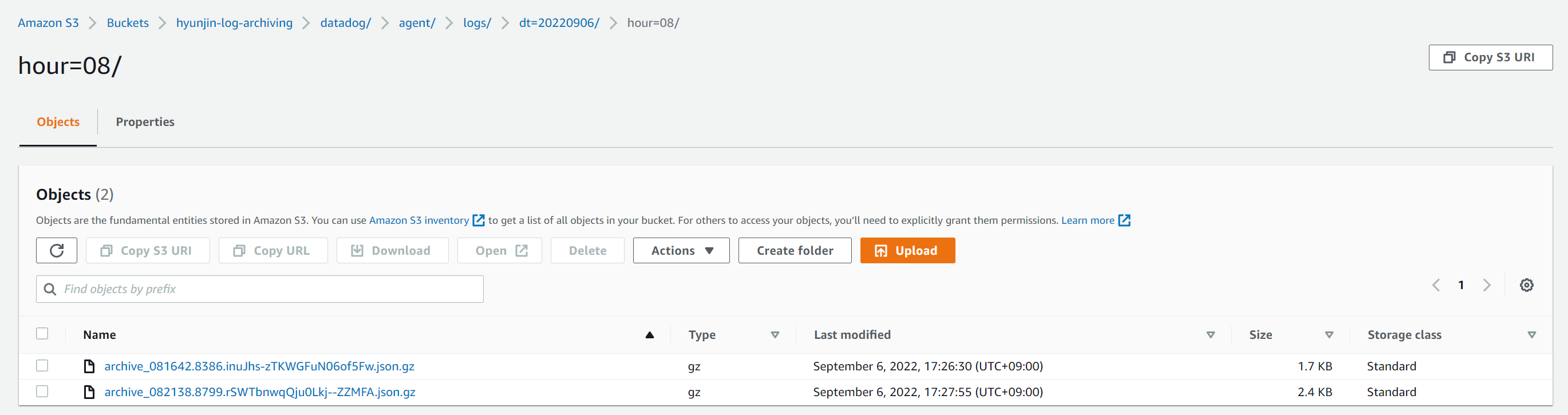 로그를 아카이브 하면 설정한 S3 내에 dt=20220906/hour=08/ 형식으로 로그가 저장됩니다.