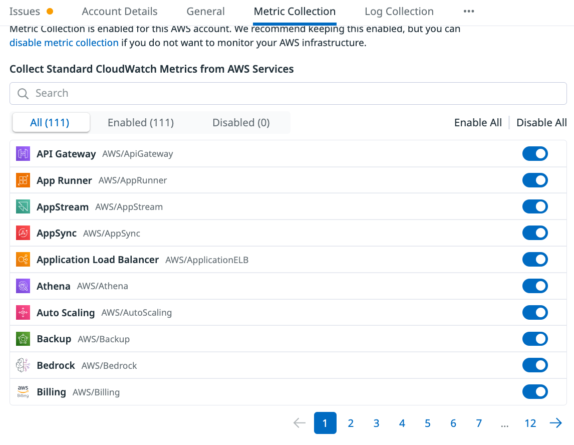 CloudWatch는 메트릭 데이터 요청에 대해 비용을 부과합니다. 기본적으로 1,000개의 메트릭 요청당 $0.01가 청구되며, 이는 Datadog이 AWS 통합에서 얼마나 많은 메트릭을 요청하는지에 따라 달라집니다. 비용을 절감하기 위해서는 수집하는 메트릭 수를 줄여야 하며, 이는 AWS 통합 타일에서 불필요한 네임스페이스를 비활성화하는 방법으로 가능합니다.