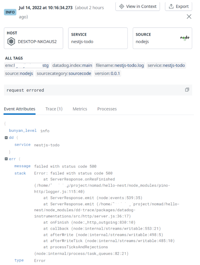 at ServerResponse.emit (/home/hj/project/nomad/hello-nest/node_modules/dd-trace/packages/datadog-instrumentations/src/http/server.js:36:17)\n