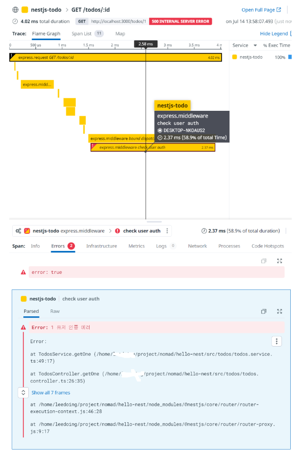Flame Graph 내에는 Trace 내에서 호출된 다양한 요청(Span)들을 볼 수 있다.