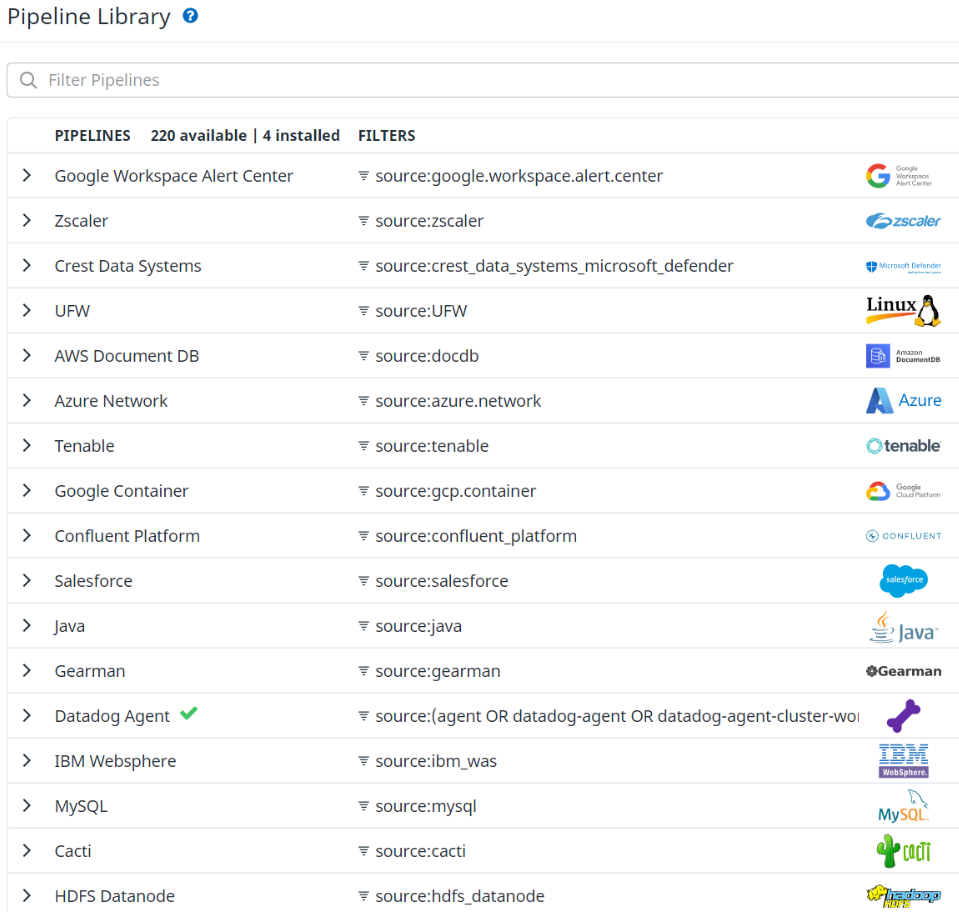추가로 로그는 프로그래밍 언어 뿐만 아니라 다양한 플랫폼 관련 로그 파이프라인도 미리 구성되어 있다.