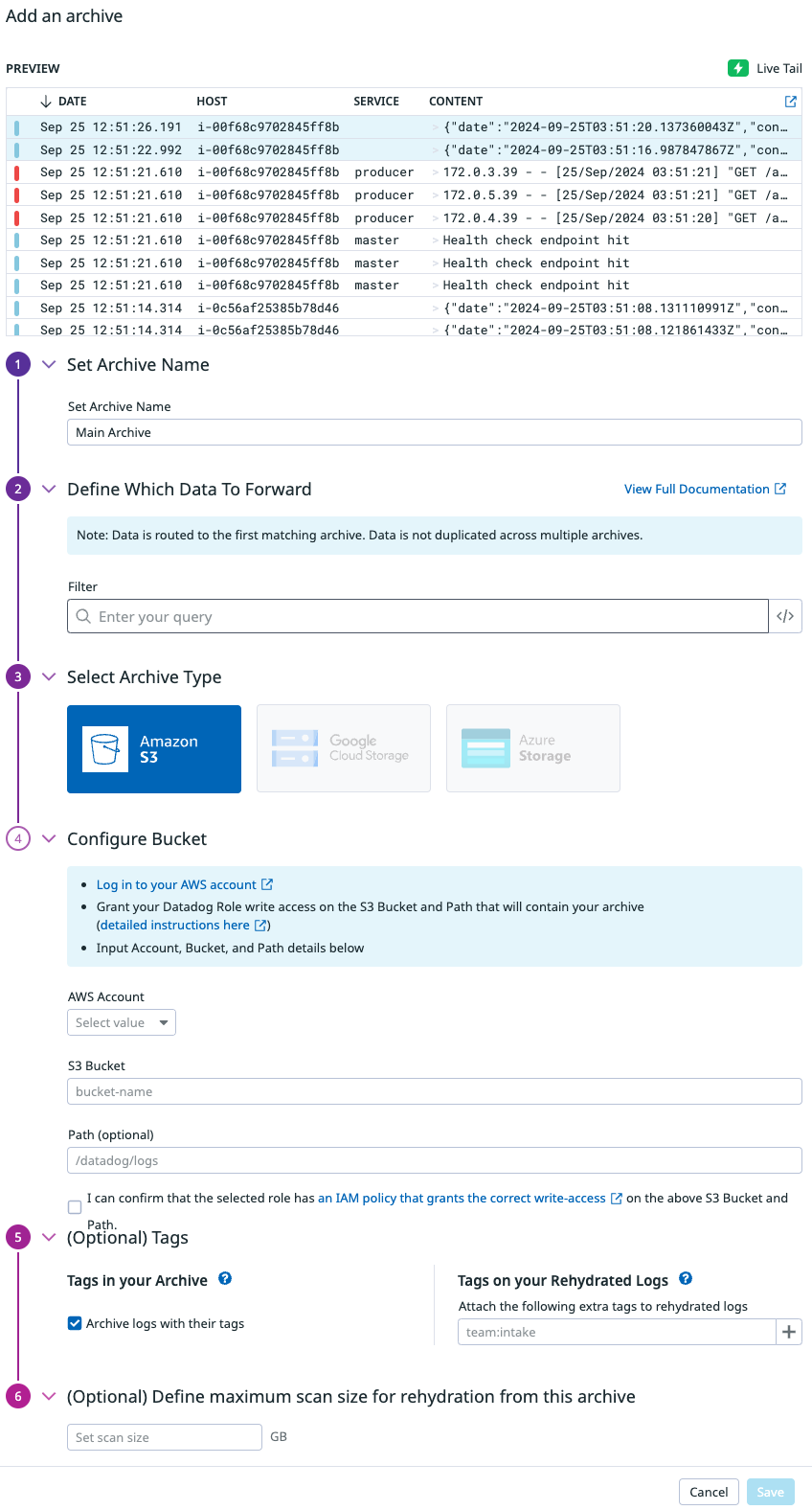 따라서 15일이 지난 로그에 대한 저장이 필요한데, Datadog에서는 AWS S3로 쉽게 아카이빙이 가능합니다.